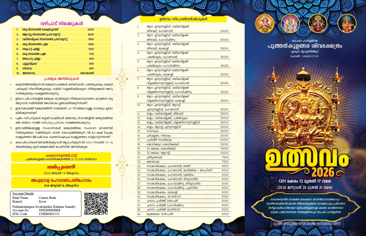 Puthankulangara temple, an ancient Siva temple with legendary background up to the Mahabharata era is situated at Eroor, between Tripunithura and Edappally near Kochi. Puthankulangara Siva temple is located at a distance of 8 kms from Ernakulam Junction Railway Station, 5 kms from Tripunithura Railway Station and 30 kms from Nedumbassery International Airport.